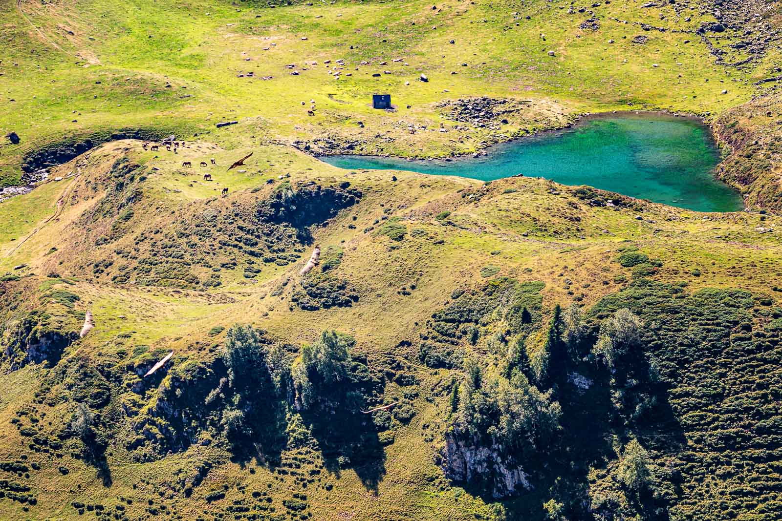 lac d'Ourrec (1 667 m), sa cabane, ses vautours. Vallée de Lesponne (65)